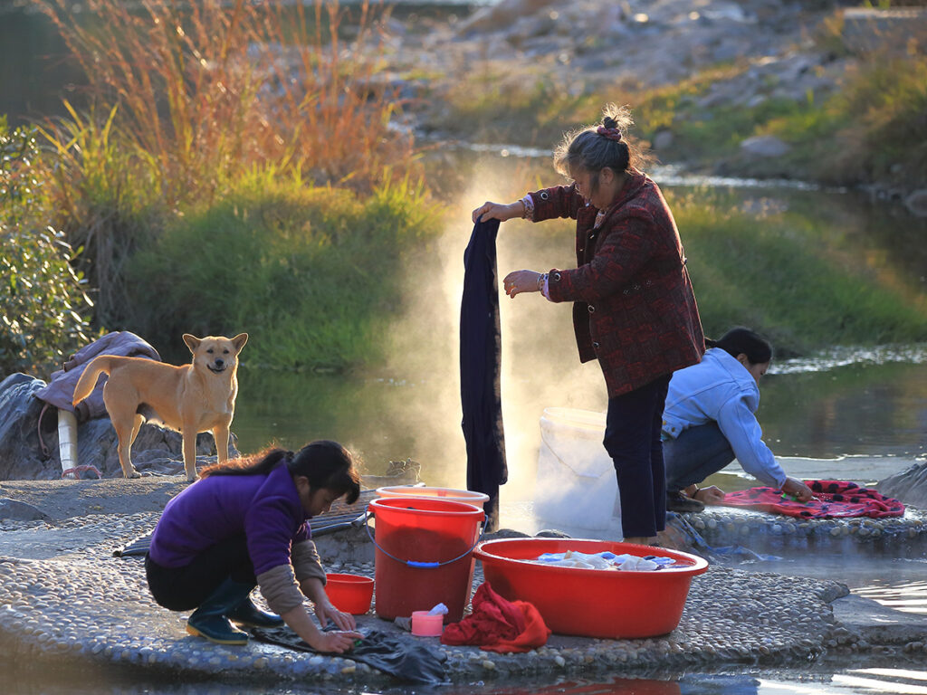 作品簡介:此照片2021年1月拍攝于湖南省汝城縣熱水鎮熱水河(因該地地熱溫泉溫度高,當地人稱之爲“湯河),寒冬之下,當地農家婦女在河中清洗衣服。