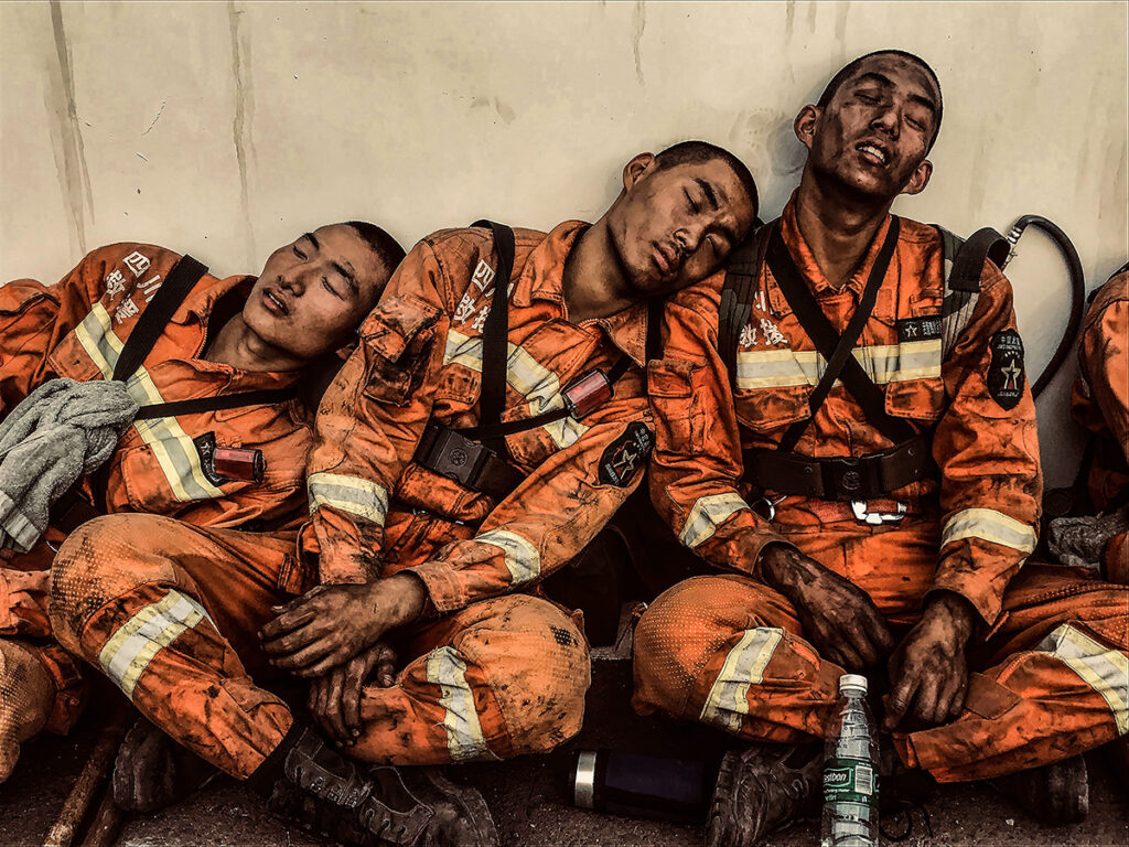 作品簡介:2020年3月30日15時51分,四川省涼山州西昌市突發森林火災,造成18名專業撲火隊員和1名向導犧牲。這是4月1日參與撲救的武警官兵撲火後休息的瞬間。