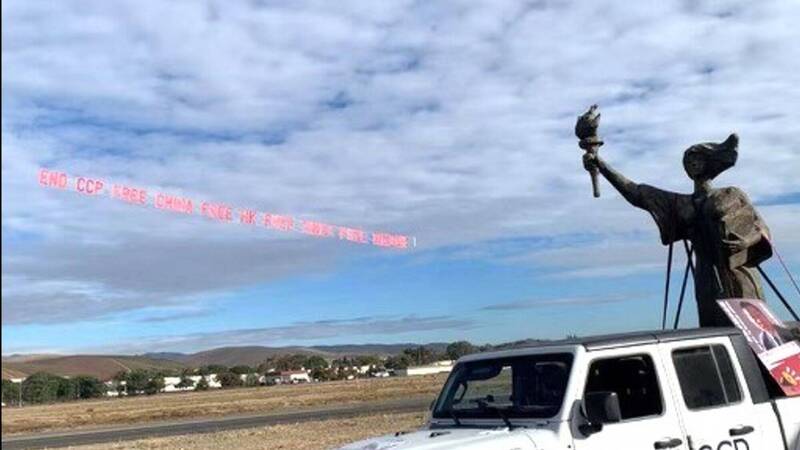 數十名中國民運人士今天一早帶著自製的自由女神像和抗議標語前往舊金山東灣的利佛摩機場,以小飛機帶起巨型橫幅飛上天。