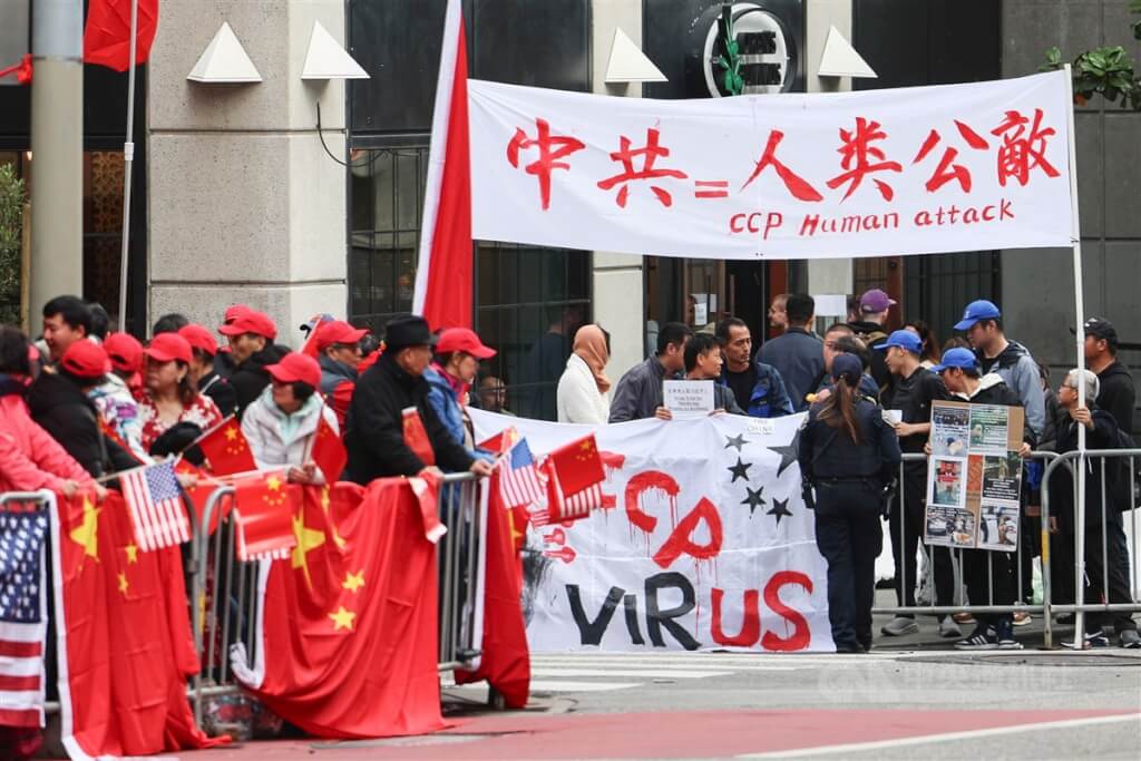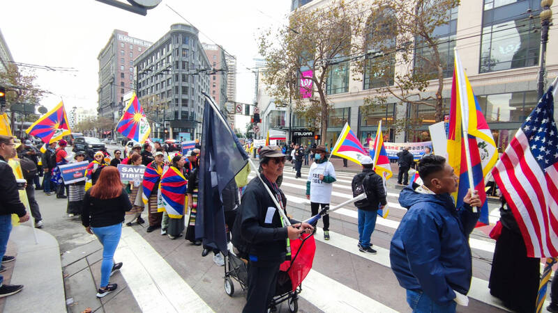 (中華新聞通訊社/中華時報11月16日訊)拜習會今天在舊金山舉行,各路抗議風起雲湧,多個抗議團體現身舊金山市區,包含手持「Save Tibet(拯救西藏)」、「Free HongKong(讓香港自由)」標語的團體,現場氣氛十分熱鬧,多元族群同時展現訴求。也有大批舉著中國五星旗的民眾,為習近平搖旗吶喊。
