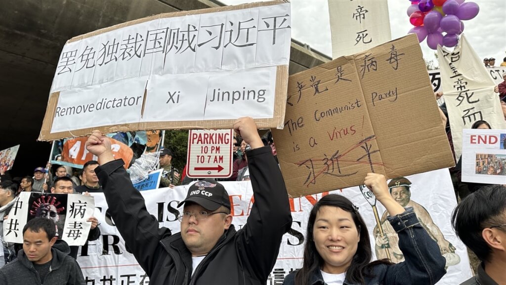 洛杉磯海外華人組成的人權團體集結兩百多人前往舊金山,抗議習訪美行程,群眾身上穿著End CCP標語T恤。召集人界立建強調,這次北上的群眾「很多人特地請假、放下工作」,是自發參與,與中國領事館花錢動員「小粉紅」來支持習近平,完全不一樣。