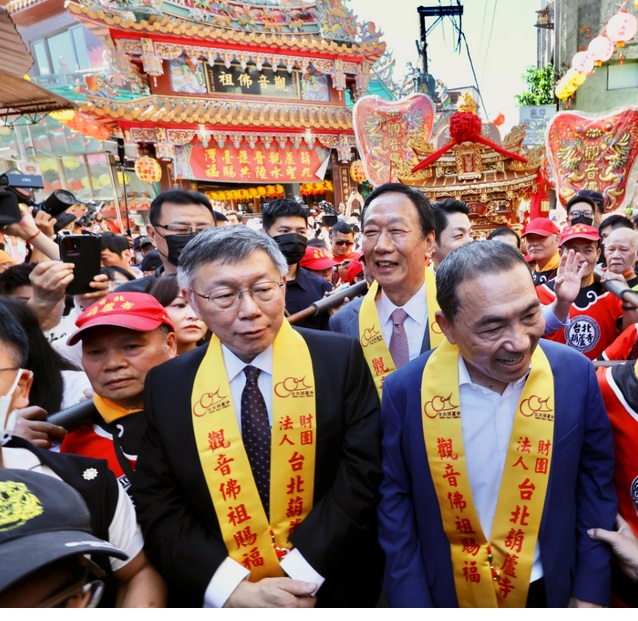 柯文哲已正式邀請郭台銘與國民黨總統參選人侯友宜,今日下午於君悅飯店公開會面。圖為侯友宜(右)、柯文哲(左)、郭台銘(中)11月2日出席台北葫蘆寺觀音佛祖聖誕遶境起駕大典。