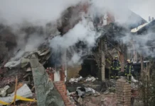 俄羅斯空襲基輔期間,一架無人機擊中一棟居民大樓,引發火災,消防員正在撲滅火災。-218x150.webp)