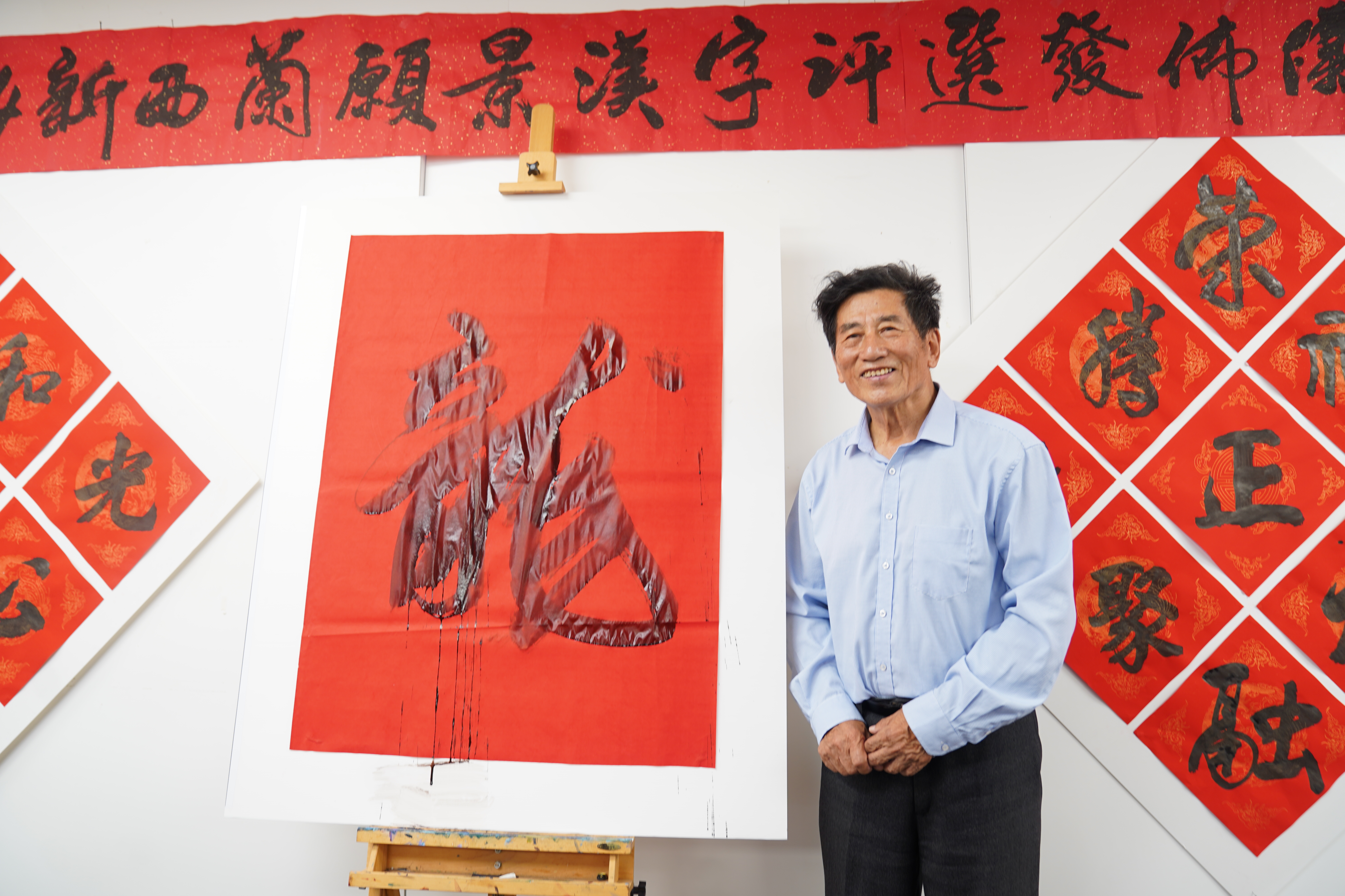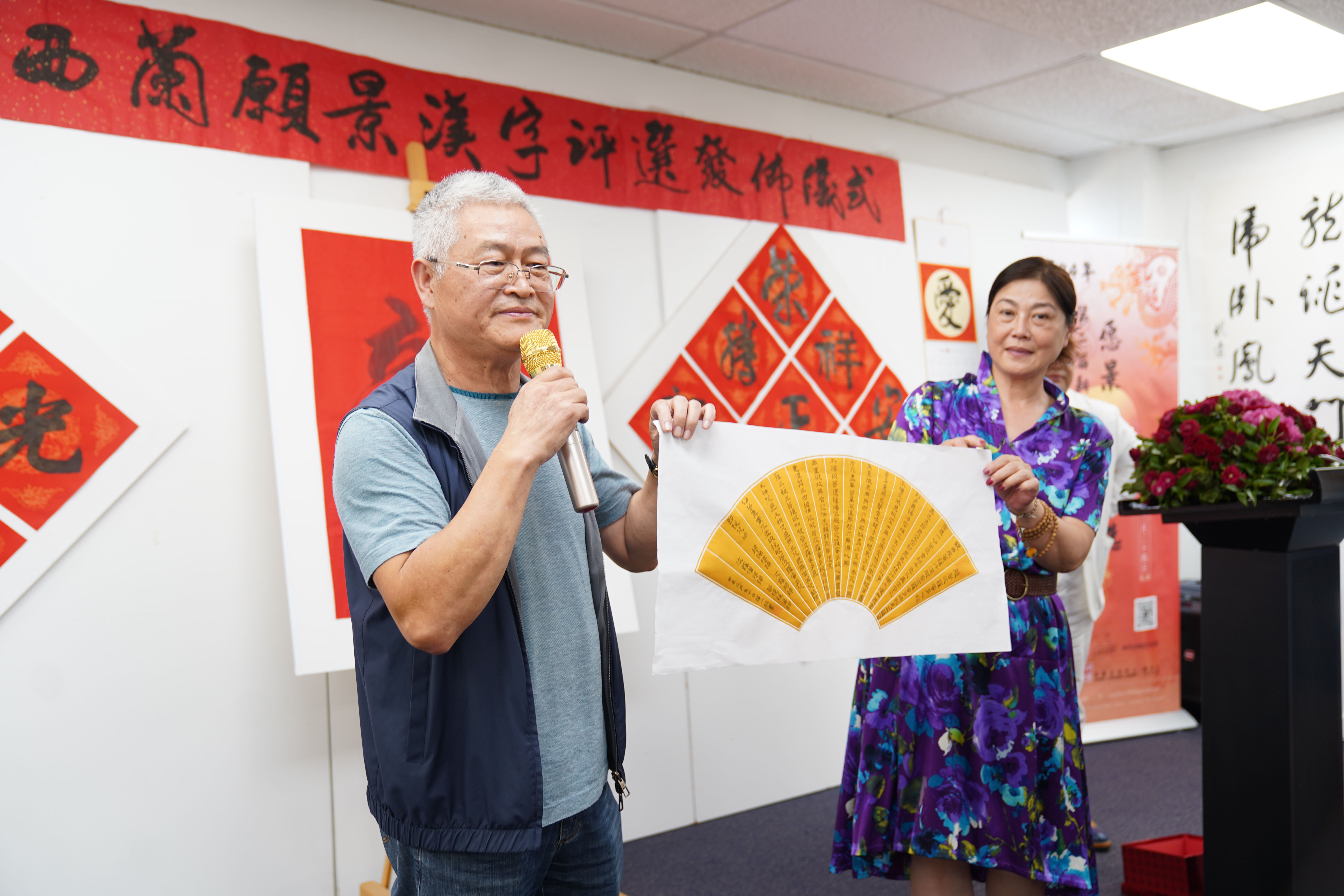 儀式的高潮是由主辦方代表宗元先生、趙玲女士與周立文化參贊、王建文主任共同揭曉了2024年願景漢字為”龍”。著名書法家傅金枝先生當場揮毫書寫了大幅的”龍”字。
