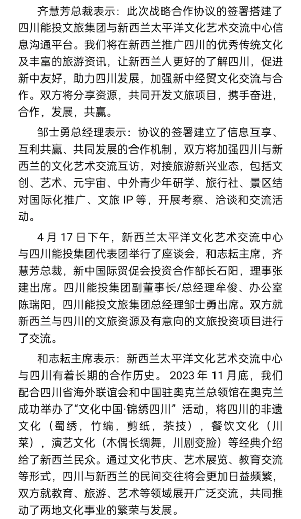 新西兰太平洋文化艺术交流中心与四川能投文旅集团签约