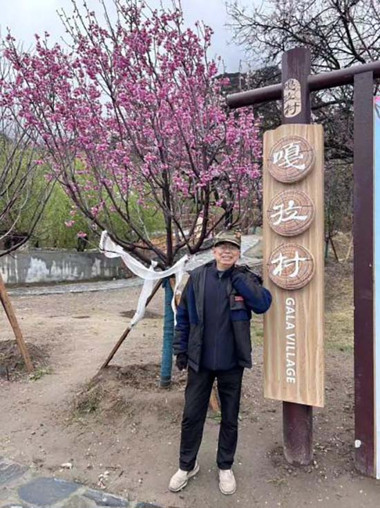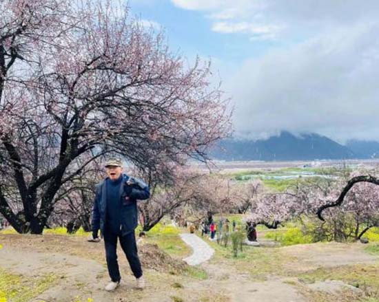 第二天按行程,我們到了林芝,遊覽了巴宜區的嘎拉桃花村,適逢這裏正在舉行桃花節。進村後放眼四望,只見漫山遍野的桃樹,粉紅色的花兒開得正盛,無論是老樹虯株新幹嫩枝,花兒均開得生機勃勃熱熱烈烈,引得眾多遊客,紛紛駐足拍照。更有當地群眾把他們雪白的哈達,掛上了桃樹的枝杈,形成了花團錦簇的狀況。在一棵被譽為樹王的百歲老樹樹幹上,釘著一塊金屬銘牌,上面錄有唐朝白居易的《大林寺桃花》中的兩句詩人間四月芳菲盡,山寺桃花始盛開。我覺得這詩句中,若臨時把山寺改為林芝,倒還是頗能準確形容遊客們此時此地看到眼前景象感受的。