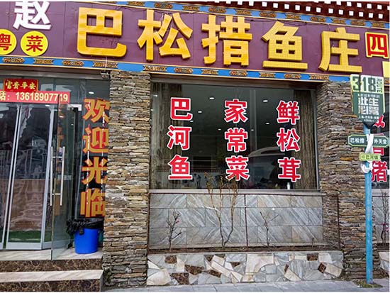 記得是48號中午,我們一行是在趕往巴松措的途中,應該說是非常接近巴松措的地方。因為此時已是吃飯的當口,我們車子開的並不快。不久就停靠在一家名叫巴松措魚莊的路邊飯店前。看其門面還挺大氣,從門外望進去,店堂也挺寬敞整潔,大家就決定進去用餐。