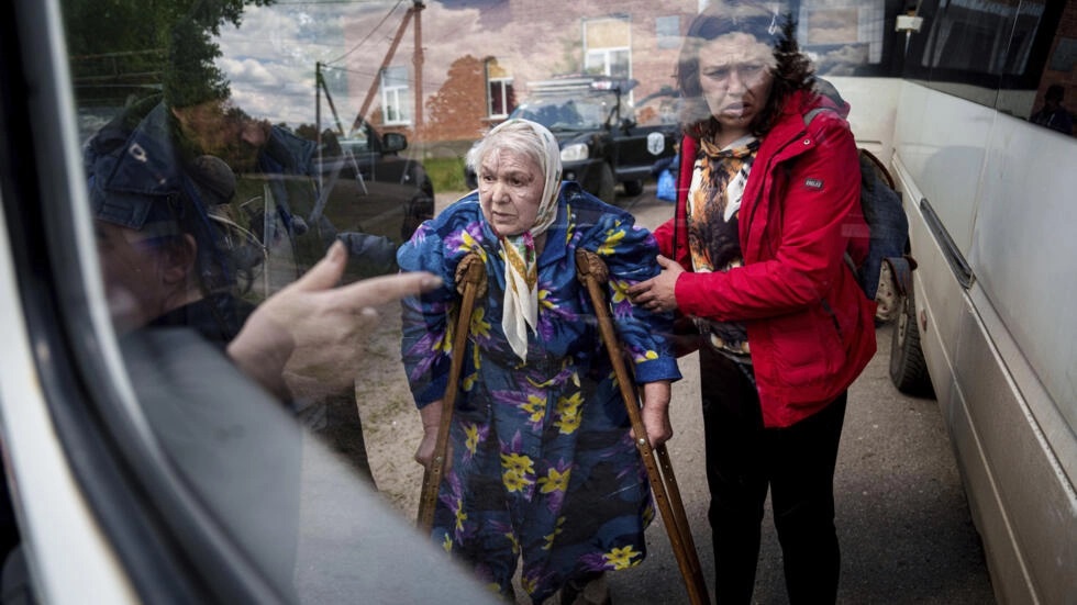 因俄羅斯炮火轟炸,2024年5月12日從烏克蘭東北部哈爾科夫附近撤出的烏克蘭居民。