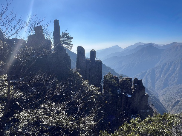 此次宜春之行的最後一活動,是第四天早上開始的遊覽羊獅慕景區。羊獅慕,好奇怪的名字?原諒我孤陋寡聞,去江西之前,我從未聽說過它。當看到行程中出現這個名字時,只覺得拗口怪異,還以爲它是個舶來詞。待查看了有關資料後,方知這個詞的後面,還是有點文化底蘊或契合當地實際景況的。關于名稱的來源,一說宋代大詩人楊萬裏曾來這遊曆,爲所見到的石筍峰的突兀秀美、周圍山景的奇異壯麗,給震撼住了,信手寫下了”筆鋒插霄漢,雲氣蘸鋒芒。時時同揮灑,散作甘露香”這樣的贊美詩句,且廣爲傳頌。以後離開這裏,尤時常思念或提及這片難忘的美景。根據這種情況,于是便被後人用作對這兒的冠名“楊思慕”了,以後也漸漸演變成“羊獅慕”。另一說,是來自于號稱羊獅慕景觀四絕(四絕分別是:奇峰怪石、古樹名花、流泉飛瀑、雲海霧濤)的最後一絕。每當雨過天晴,山間雲霧翻滾,時常會出現群羊與獅子在山間追逐嬉戲的場景,于是人們又將楊思慕改叫爲羊獅慕,而這又便逐步演變成爲該景區的正式名字了。該地距我們下榻的酒店有100多公裏,車行需兩個來小時。到了景區後,我們先乘索道車上山,到了山頂後再換乘觀光車。由于整個行程的時間關系,我們在羊獅慕景區只能停留半天,且就走了淩雲棧道這條遊覽線。該棧道全長4000余米,蜿蜒于懸崖峭壁之間。雖然天氣晴朗,風清雲淡,但背陰的地面上仍有些未融化的殘雪,走路還得小心防滑,感覺比前兩天明月山的青雲棧道好走多了。沿途奇峰怪石交替出現,如有“屠龍刀”、“官帽石”、“姊妹峰”等景觀。真可謂移步換景、一步一景。所以這裏也有“江西的張家界”之美譽。自然景致的奇麗很出乎我們的意外,不過也有些許的遺憾,因爲期待中的雲海、佛光、晚霞等景觀都沒有遇上,只能期待下次有機會再來遊玩,再慢慢的感受羊獅慕的獨特魅力了。