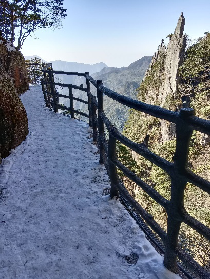到宜春的第二天晨起,稍作了下活動,便用早餐。之後就坐上預訂的飯店小客車,由它將我們送到溫湯鎮後面的明月山景區。辦理好有關上山手續,我們便從山腳坐纜車直奔山頂。纜車內還比較寬敞,可容7、8個成年人分兩邊寬松地坐著。纜車四壁除對稱的開了兩扇門外,其余都是用透明的有機玻璃圍著,呈封閉狀。在纜車升頂的過程中,從車中可看到外面的景致。惜時間尚早,山中騰起一股霧霭,望出去就是一片模糊的綠色。到了山頂感覺有點寒意,出站後見地面白茫茫一片。原來是前兩天山上下的雪一直未化。山頂有個圍著鐵絲網的滑雪訓練場,但望進去沒幾個人在活動。我們沿著邊上一條通往山頂的盤山公路往下走著。由于路面的積雪太厚,被過往的車輛來回碾壓,有的融化了,又結成冰,弄得地面濕漉漉滑溜溜的,很不好走。我們只得改從公路左側的木質棧道上行走。雖然這裏的積雪更厚,但想來下面是木板,所以走起來更無心理負擔,感覺好走一些。就這樣深一腳淺一腳地,一路走到了夢月山莊。進莊不久就見一較大的洞窟。旁邊的標識牌說明這是通往星雲洞、青雲棧道和月亮湖入口。進內沒走幾步,就發現這洞其實就是直筒狀的深坑。順著人工鑿出來盤旋而下的石階,走了相當幾十層樓高的台階,終于來到了洞底。此時眼前看到石階旁的洞壁出現一條寬敞的隧道。望過去前方隱約還有亮光,于是便心中有底興致勃勃地沿著隧道往前走。走了一陣突然豁然開朗,原來出了洞了,現正站在半山腰的一條石質道路上。路邊的指示牌上,已明確的告訴我,我已站在全長3100米的“青雲棧道”起點上了。環顧四周,可見該棧道橫亘于懸崖峭壁之上,迎客松及各類灌木點綴左右。據說這裏常年雲霧缭繞,人行其間,似在雲中漫步,這大概就是棧道前冠以“青雲”之名的由來吧。我在棧道上行走之時,天還比較陰冷,地上還有點殘雪。爲防摔跤還不能放眼四望,隨意拍照什麽的,只覺得眼前一片蔥綠,也沒有什麽特別之處。棧道的盡頭是月亮湖。