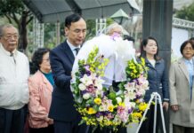 國民黨主席朱立倫偕同228事件家屬代表,前往228和平紀念公園獻花致意。他表示,和平要靠大家打拚才能得到,尤其對執政者、政府而言,應該要謙卑、反省。 (國民黨文傳會提供)