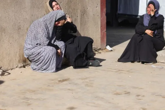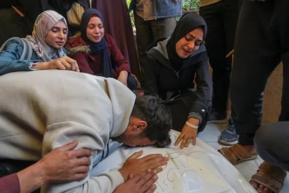 2025 年3 月28 日,在拉法市以色列軍隊的砲火中喪生的民防官員安瓦爾·阿卜杜勒的親屬,在他的遺體被從納賽爾醫院運往加沙汗尤尼斯安葬時痛哭 - 加薩衛生部表示,自2025 年3 月18 日以色列違反與哈馬斯的停火協議以來,以色列的攻擊已造成該地區896 人死亡,1984 人受傷。