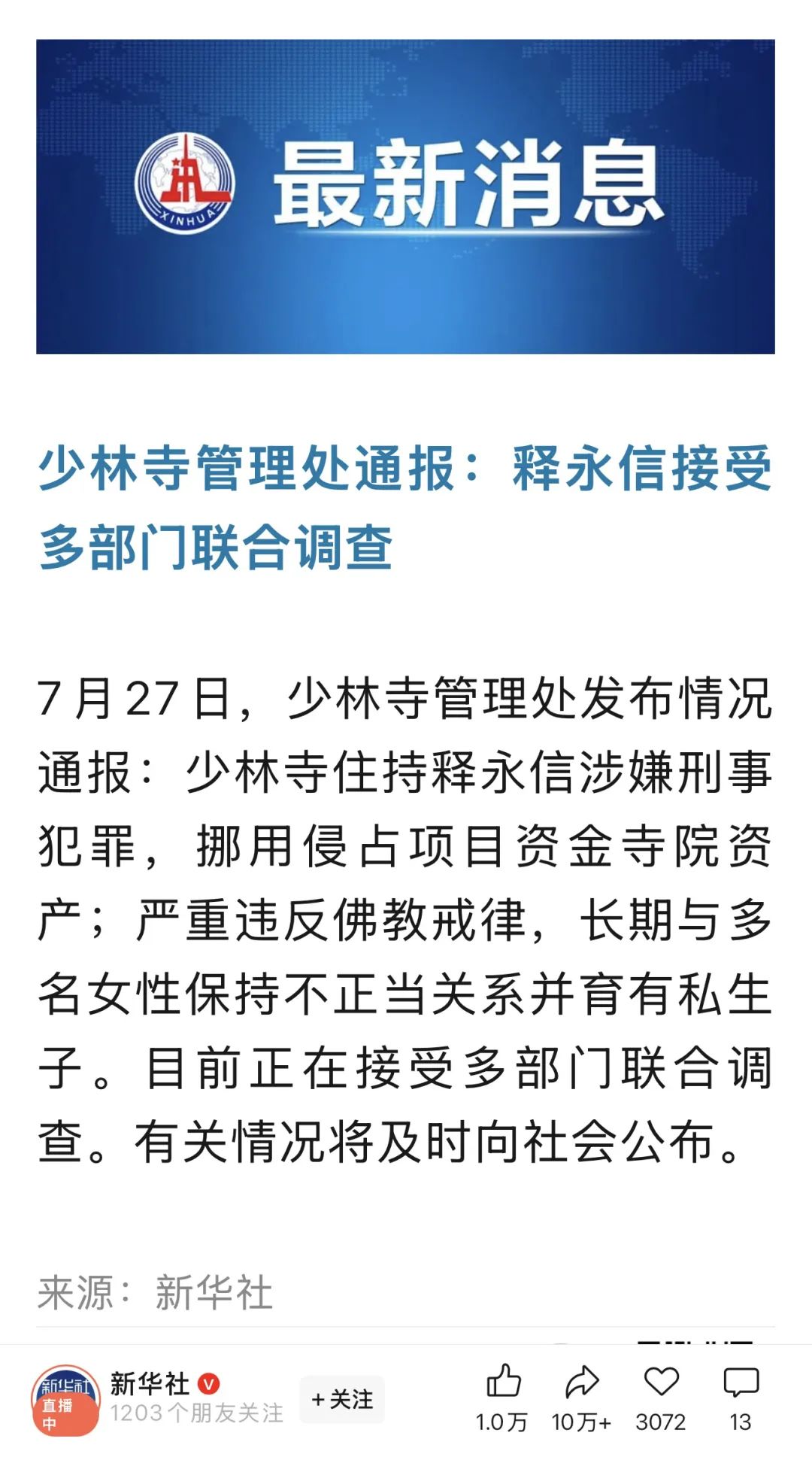 少林寺管理處關於釋永信涉嫌刑事犯罪與違反戒律的通報,猶如一記重錘敲擊在當代社會的道德神經上。這一事件絕非單純的個人墮落,而是折射出宗教倫理與世俗權力交織下的深層危機。當袈裟不再象徵清淨修為,當方丈室淪為權力尋租的場所,我們不得不追問:宗教領袖的道德潰堤究竟撕裂了怎樣的文明契約?