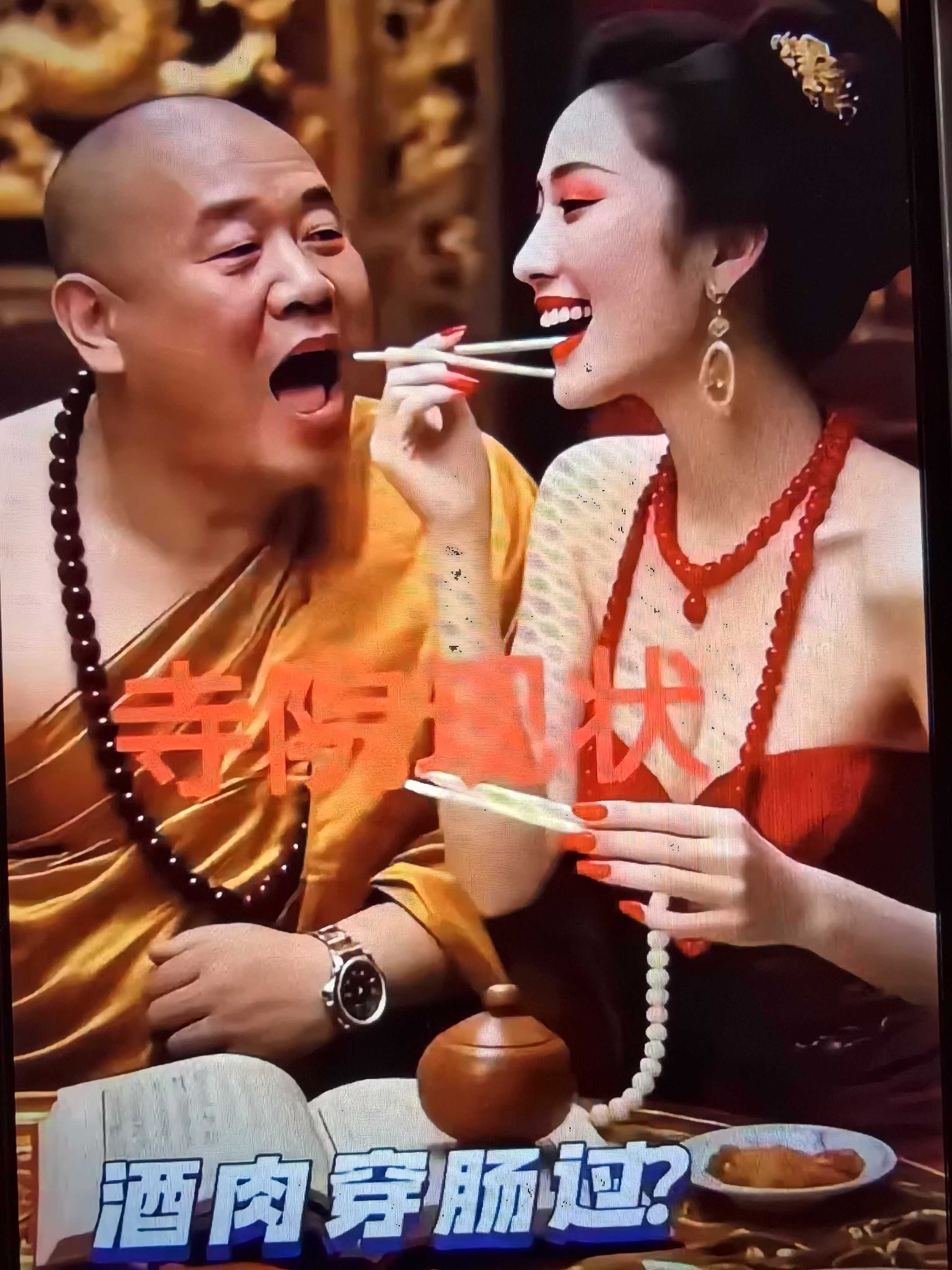 和尚們早已是四大不空、六根不靜,飲酒食肉,溝女玩樂,無所不作!白天香火繞緲,青燈木魚、念經拜佛;夜晚咖紗一脫,去夜場左攬右抱、花天酒地!