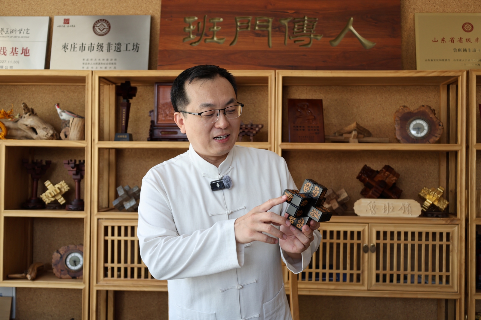 在當代,魯班智慧正煥發新的生機。走進山東省級非物質文化遺產魯班鎖製作技藝代表性傳承人李浩的工作室,六柱魯班鎖、九柱魯班鎖在陽光裡流轉著琥珀色的光暈。
