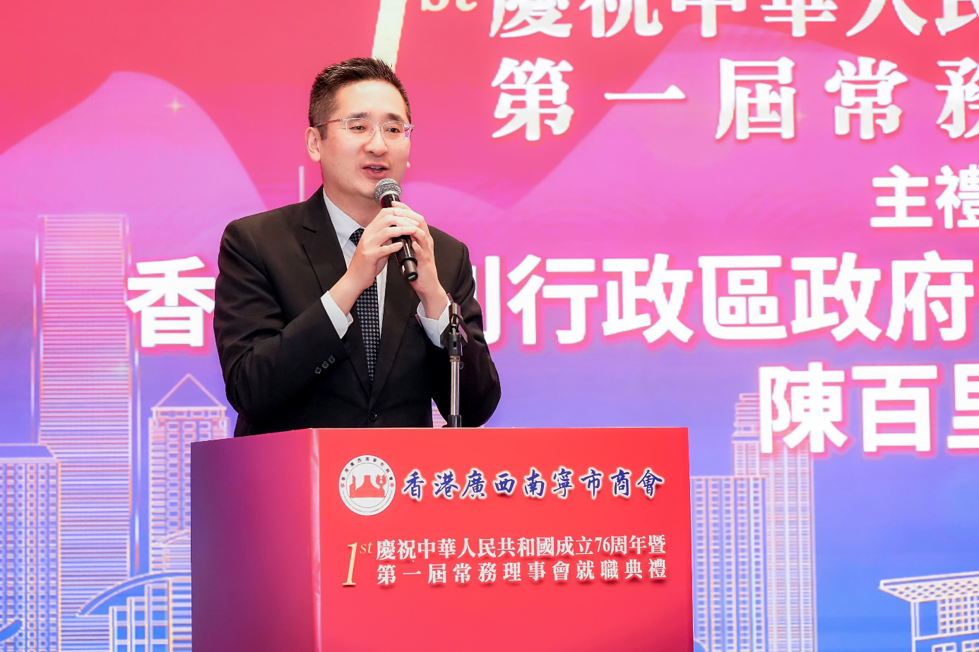 陳百里副局長致辭時肯定了商會成立對桂港兩地經貿發展的促進作用,並表示南寧市是中國與東盟的重要交通樞紐及出海通道,憑藉中國-東盟博覽會的戰略窗口角色成為區域合作關鍵節點。他強調,香港應善用國際網絡及專業服務優勢,協助內地企業「走出去」,將國際企業「引進來」,深化企業協作,共同推動桂港經貿深層次發展。