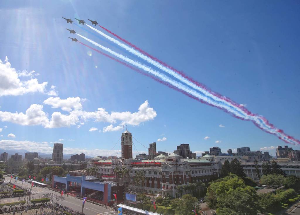 國慶大會今天上午在總統府前廣場登場,主題表演的最後壓軸,由空軍雷虎小組「勇鷹」高教機以5機編隊施放彩煙飛越總統府上方,為中華民國114歲獻上空中祝賀,為國慶大會劃下完美句點,這也是雷虎小組換裝國造勇鷹高教機後首度在國慶大會亮相。