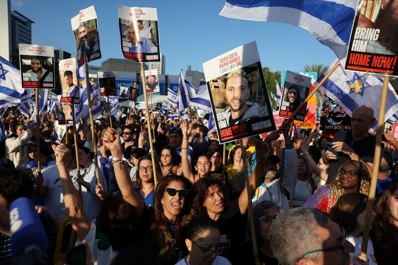 数百人聚集在特拉维夫的人质广场(Hostages Square),他们欢呼雀跃,挥舞着以色列国旗,并高举着人质的海报。
