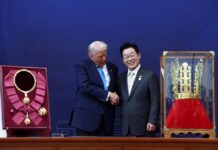 29日獲得韓國總統李在明(右)頒授韓國最高級別勳章無窮花大勳章,李在明並贈送韓國新羅王朝文物天馬塚金冠模型。(路透社)-1-218x150.jpg)
