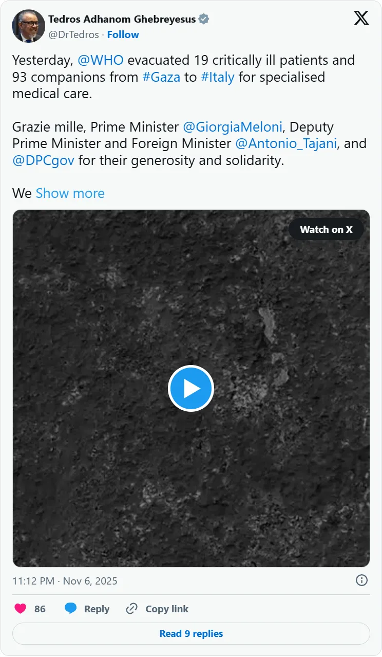 他指出,世卫组织最近已将19名危重病人及其93名陪护人员从加沙撤离到意大利接受治疗,并对意大利政府的声援和支持表示感谢。
