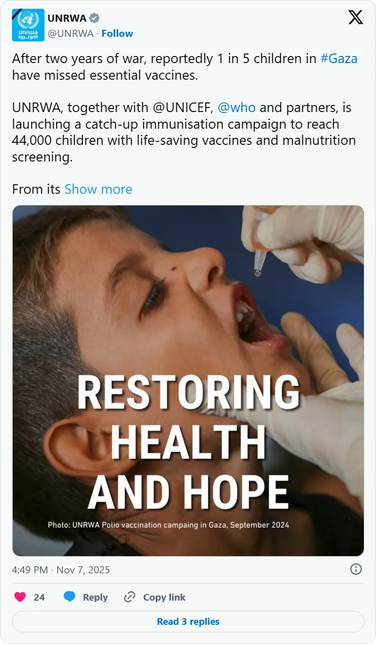 近东救济工程处表示:“近东救济工程处将通过其在加沙地带的24个卫生中心和医疗点,为这项恢复加沙儿童基本医疗保健的重要工作提供支持。”