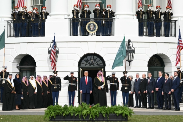 週二,川普總統在白宮南草坪為沙烏地阿拉伯王儲薩勒曼的來訪舉行了盛大歡迎儀式,包括儀仗隊以及美國戰機編隊飛越白宮上空等排場。薩勒曼所乘坐的豪華轎車由美國陸軍騎兵儀仗隊護送駛入白宮車道。當薩勒曼下車時,受到了川普總統的親自迎接。總統面帶微笑,在紅地毯上與薩勒曼握手致意,數十名軍人在周圍列隊。
