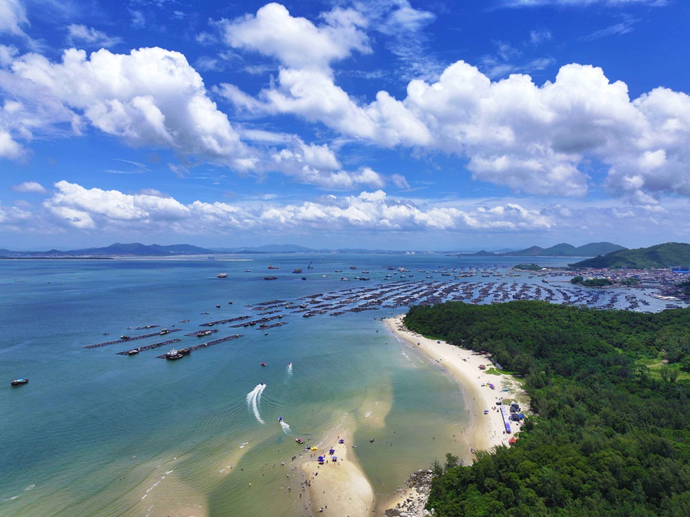 作品說明:一年一度的開魚節,15日的晚上還是狂風驟雨,到了這天就特別好運氣,陽光普照藍天白雲,雲端像白龍遨遊在藍天上,觀賞着美麗的海陵島,用航拍記錄美麗。