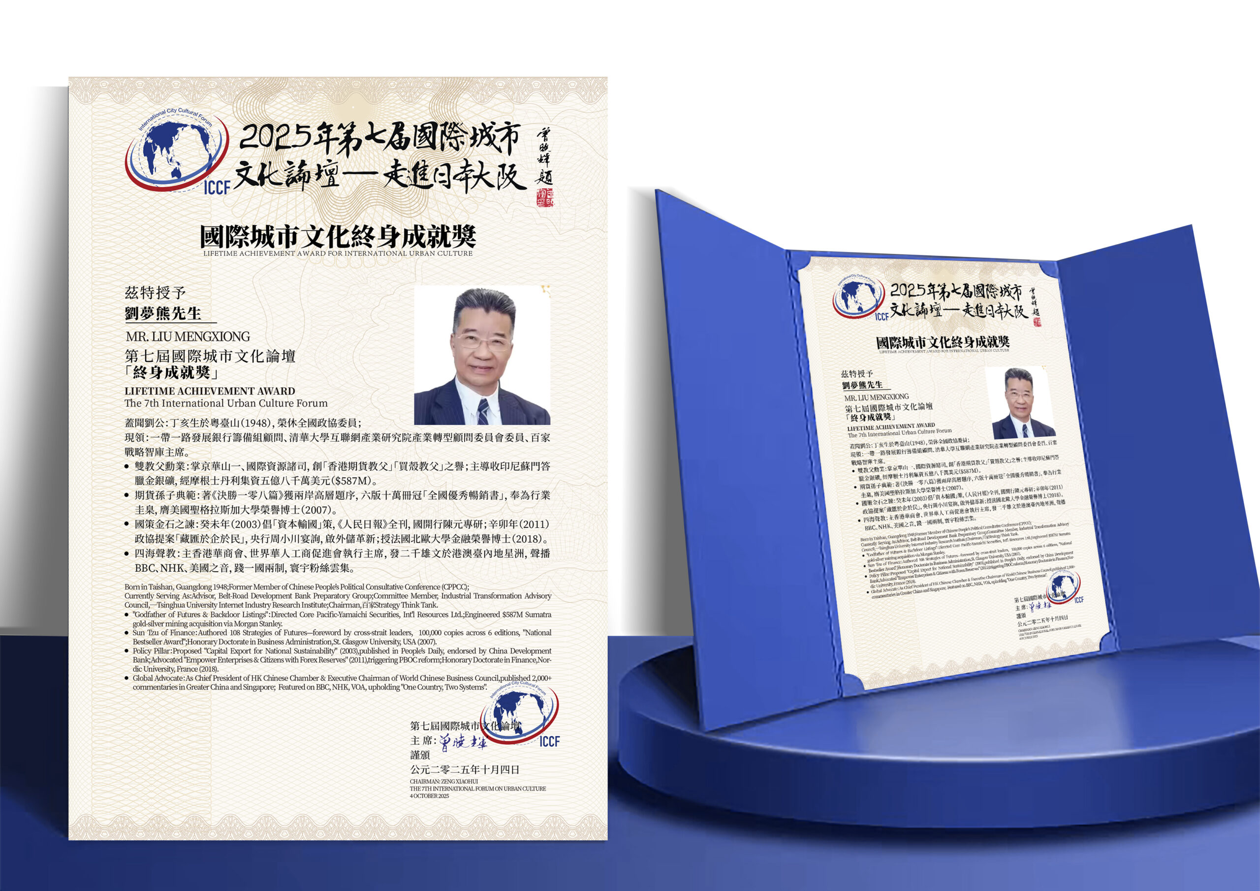 劉博士近期積極參與由本集團主辦的「國際城市文化論壇」活動(包括在2022年香港、2024年新加坡及2025年日本大阪舉行的系列論壇),並榮獲2025年國際城市文化論壇終身成就獎,彰顯其全球影響力。