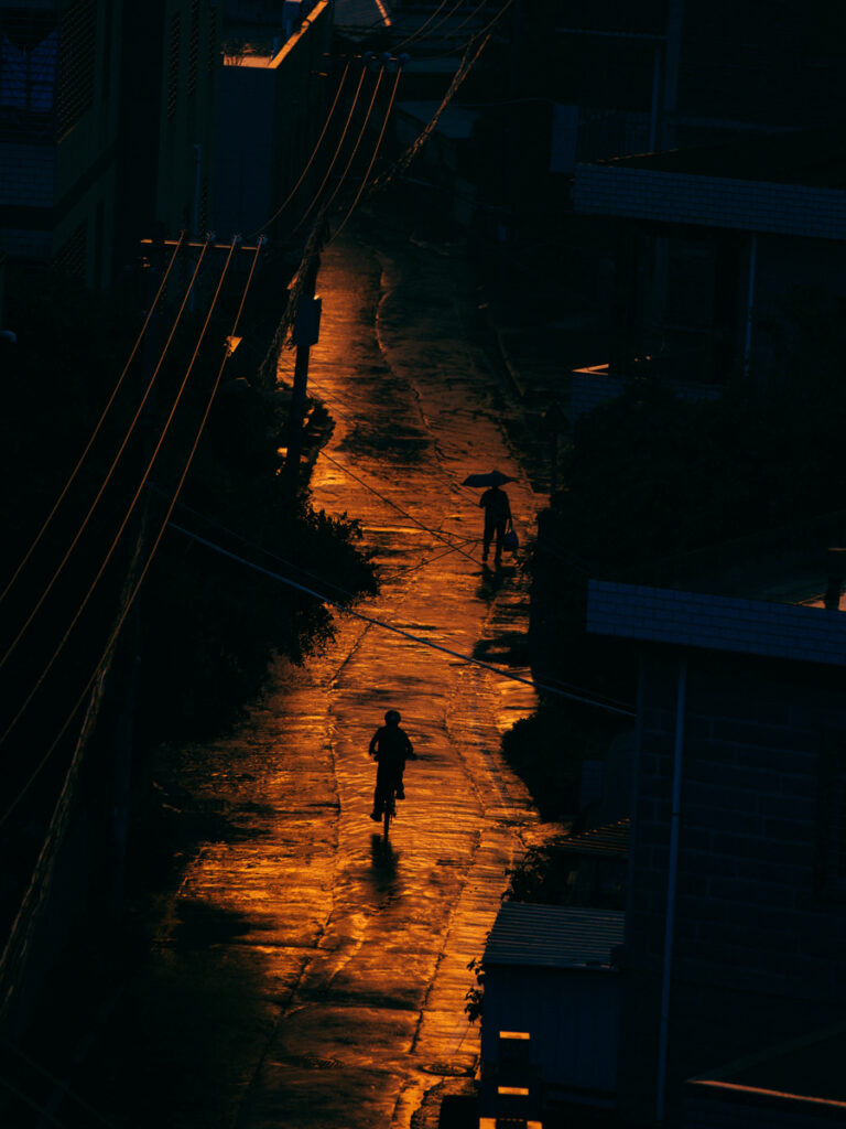 作品說明:于2025年7月31日在泉州的壹個小鄉村陽台視角裏,夕光落進雨巷,灰調街巷浸成暖橙。正遇撐傘阿姨緩行,少年卻踏車碾過光的褶皺,奮力爬坡的鮮活,與慢調的歲月,疊在濕徑的光影裏——這偶然撞見的同框,是生活最溫柔的對照。