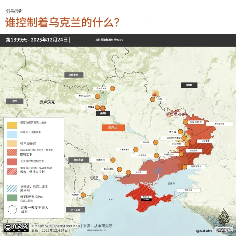 烏克蘭方面通報,俄羅斯在聖誕前後持續發動大規模空襲。烏克蘭空軍表示,周三平安夜晚間至周四早上,俄軍一夜之間向境內發射131架無人機,其中106架被擊落或壓制,但仍有22架在15個地點造成影響。美國媒體ABC報道,敖德薩州長基佩爾(Oleh Kiper)指出,俄軍鎖定港口與工業基礎設施,至少造成1人死亡、2人受傷。國家緊急服務部門通報,哈爾科夫州在24小時內遭到一系列攻擊,至少1人死亡、14人受傷;切爾尼戈夫一棟高層住宅遭無人機擊中,並有能源設施遇襲,造成死傷與停電。烏克蘭國家電力營運商表示,多個地區出現停電並實施用電限制。