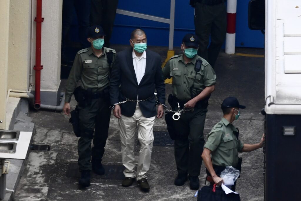 1月12日,反中亂港分子黎智英與蘋果日報3家公司涉嫌違反香港國安法等案件進入求情程序。圖為2020年12月12日,黎智英由懲教署人員押上囚車(資料圖)。 中新社記者 李誌華 攝