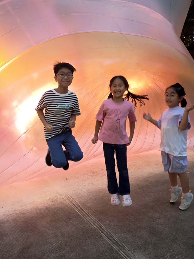作品說明:本作品拍攝於,今年10月1日,我在上海蟠龍古鎮拍攝到的,三個兒童在形似兔子的氣球包裏比賽誰跳的高,整個畫面充滿童趣。