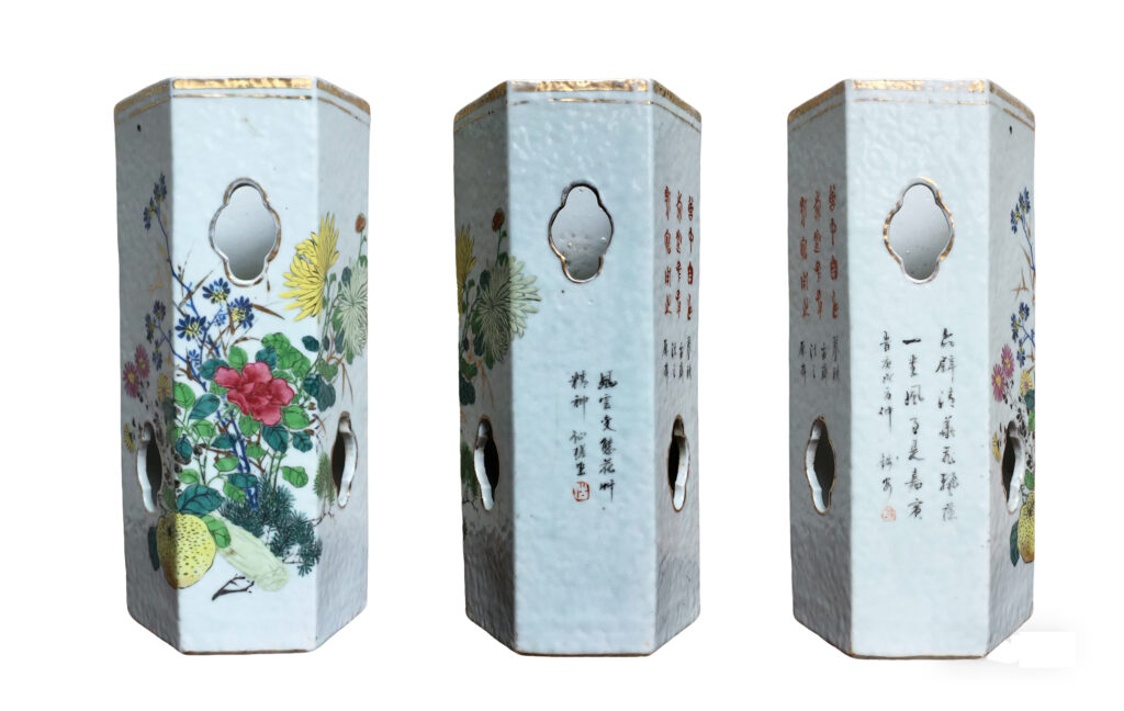 此帽筒為晚清民國常見家居擺件,六方形製鏤空.海棠花窗,通體施白色桔皮皺紋底釉,釉水肥厚滋潤。六面滿繪花卉、書法銘文與印章,正面以牡丹、菊花為主體,松、椿、竹、檸檬、蓮藕等相襯,工意相融,構圖靈動。設色艷麗純正,竹葉飾金彩,牡丹著大紅,蔬果與菊花用檸檬黃、粉黃,部分菊花與椿樹小花采用堆粉技法,呈突起質感;其余彩繪平抹凝重,釉面光滑亮澤,疑似敷薄釉,盡顯工藝精妙。