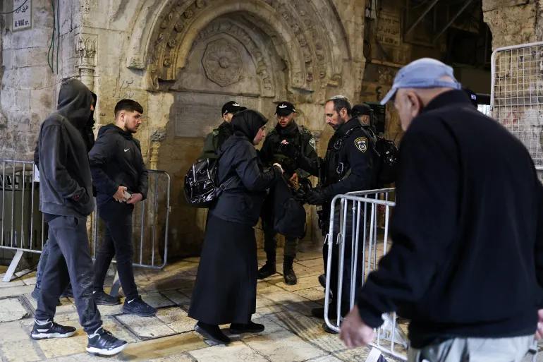 2026年2月17日,在耶路撒冷舊城,巴勒斯坦人穿過檢查站進入阿克薩清真寺,為即將到來的齋戒月做準備。路透社/阿馬爾阿瓦德