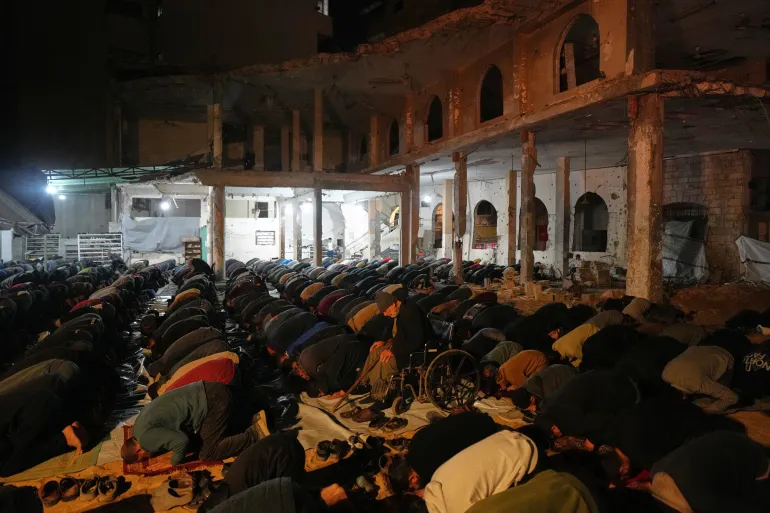 2026年2月17日星期二,在加薩城,穆斯林信徒在齋戒月首夜於阿爾坎茲清真寺進行泰拉威祈禱。該清真寺在以色列與哈馬斯的戰爭中遭到破壞。 (美聯社照片/傑哈德·阿爾什拉菲)