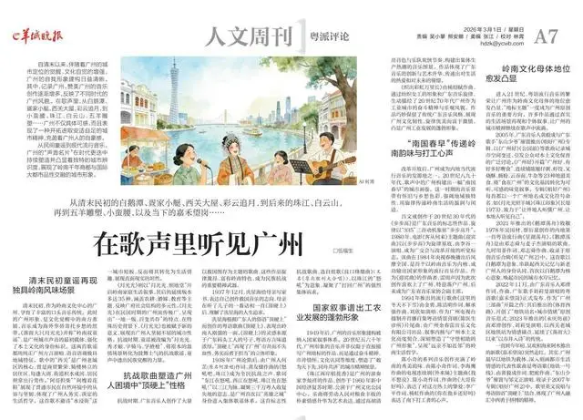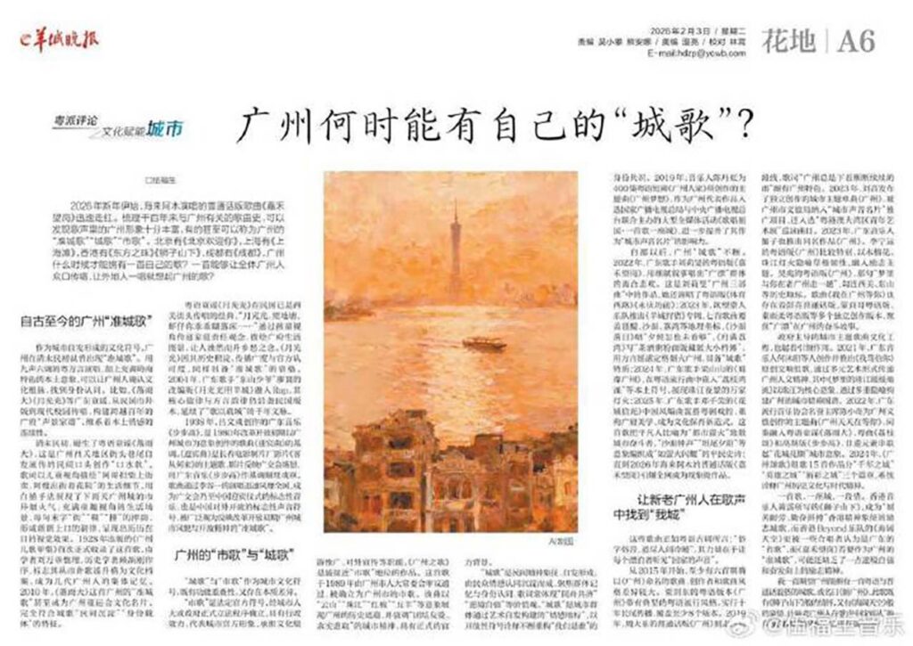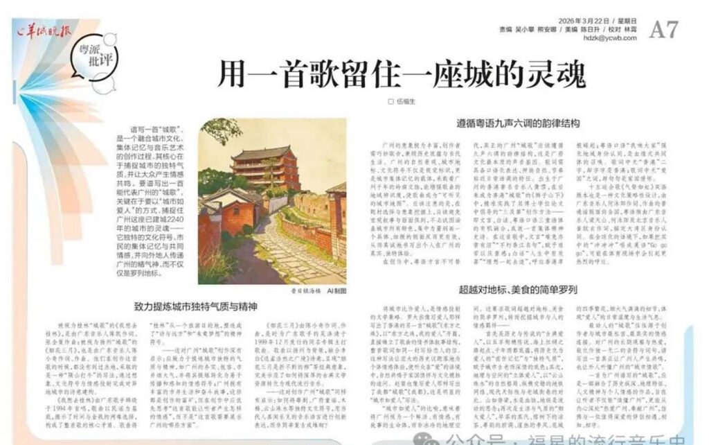 今年二三月,伍福生在紙質版的《羊城晚報》“粵派評論”專欄陸續推出了均是大報半版的《廣州何時能有自己的“城歌”?》《在歌聲裏聽見廣州》《用一首歌留住一座城的靈魂》等系列“城歌三部曲”,率先推出了“准城歌”和“城歌”的話題和標準。