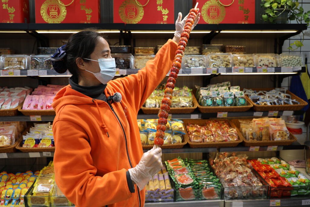 12月4日,山東濟南,店員展示新鮮出爐的“1米糖葫蘆”。王采怡 攝