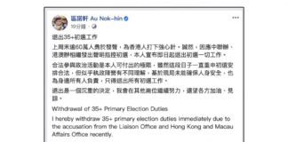 區諾軒稱因應兩辦聲明 退出初選一切工作