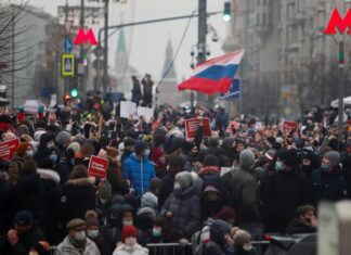 周六在俄罗斯多个城市,抗议者走上街头,要求...