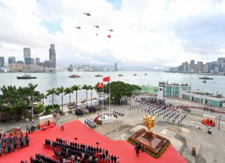 特區政府在會展舉行升旗儀式和國慶酒會 中聯辦也舉行升旗儀...