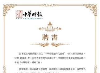 中華時報在阿聯酋迪拜設立代表處,劉珊珊聘為首席代表
