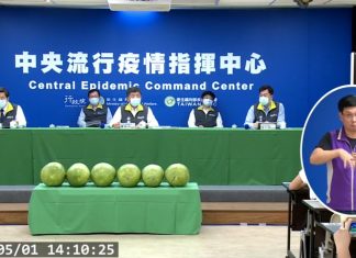 疫情指揮中心下午舉行記者會時,在現場擺放了6個大西瓜...