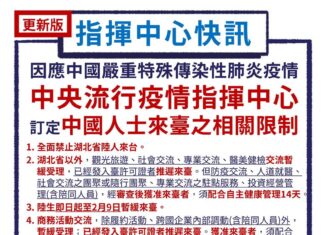 武汉肺炎疫情蔓延至台湾,台湾的疫情指挥中心周一(27日)表示,加强管制赴台人员资格,新增具外国和港澳永久居留权的民众,即日起暂缓受理赴台申请,而入台证的期限亦顺延。