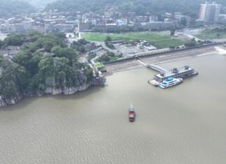 中新社南昌6月24日電 (記者 姜濤)因近日持續降雨,鄱陽湖水位快速上漲突破15米大關,千年石島落星墩與石鍾山溶洞等標誌性景觀再次沒入水中。