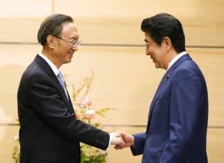 日本首相安倍晋三与到访的中共中央政治局委员...