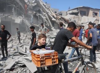 以色列空袭命中了加沙城一所收容流离失所巴勒斯坦人的联合国学校。加沙城的一栋多层住宅楼也遭到轰炸并被摧毁。
