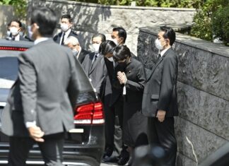 遇刺身亡的日本前首相安倍晉三,遺體由靈車在清晨移送離開奈良的醫院,車隊在中午過後,抵達他在東京的住所。安倍遺孀安倍昭惠在靈車經過時,雙手合十,數名自民黨員鞠躬默禱。