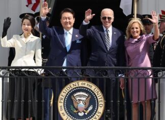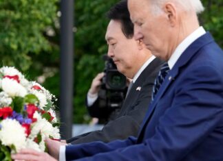 (中華新聞通訊社/中華時報4月26日訊)國事訪美的南韓總統尹錫悅,當地星期二與美國總統拜登前往華盛頓的韓戰紀念碑獻花。