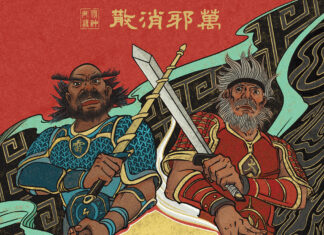 作品说明:插画整体美术风格参考了中国壁画的色调和肌理感,花纹元素来自中国传统的雷云纹、火纹、祥云纹,灵感来自武汉建设的雷神山与火神山医院。雷神与火神以中国门神的构图形式出现...