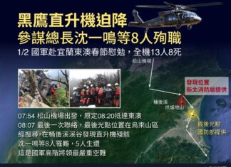 一架载有高级军事将领的黑鹰直升机于台北时间1月2日坠毁在台湾东北部山区,机上13名人员中的8名丧生,包括参谋总长沈一鸣上将。事故发生后,台湾总统蔡英文下令调查失事原因。台湾...